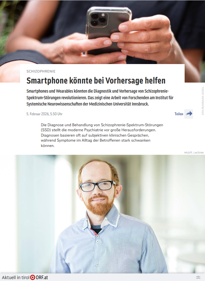 Assist.-Prof. Johannes Passecker, PhD, from the Medical University of Innsbruck, is involved in pioneering research on the use of digital phenotyping to improve the diagnosis and monitoring of schizophrenia spectrum disorders. This innovative research was featured by ORF, highlighting how data collected through smartphones and wearable devices can provide objective markers of patients’ behavior and cognitive performance.