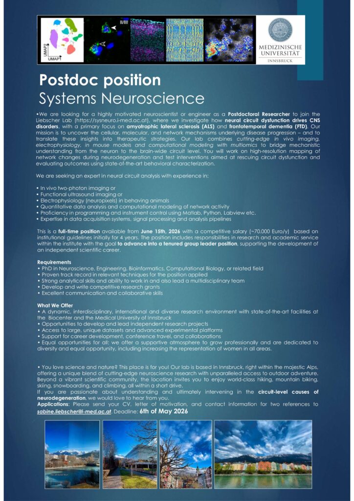 Open Postdoc Position in Systems Neuroscience Posted on April 17, 2026 - 11:44 by Andrea Paulette Razo Ochoa https://www.nature.com/naturecareers/job/12858388/postdoc-systems-neuroscience-in-neurodegeneration/?LinkSource=PremiumListing