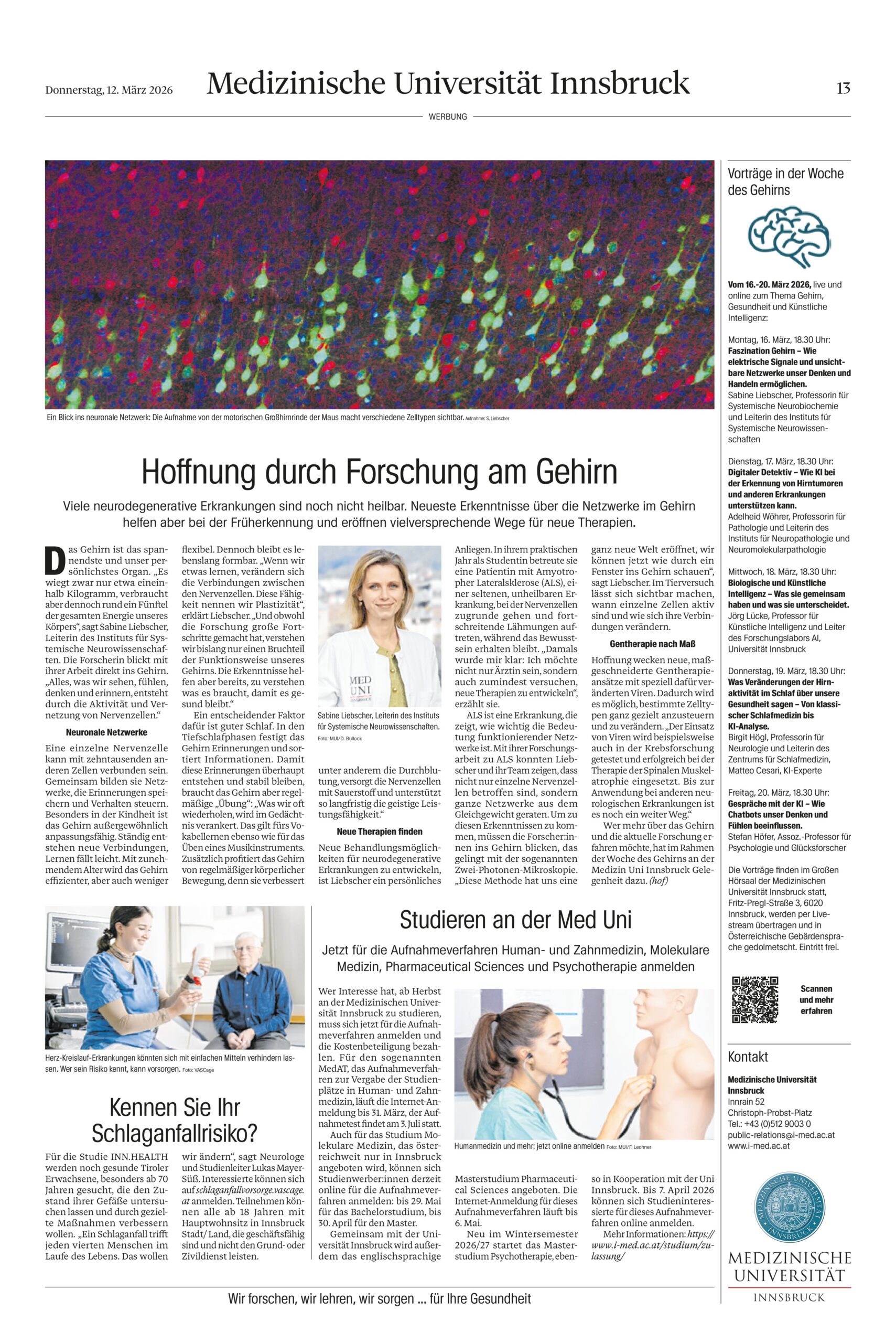 Univ.-Prof.ⁱⁿ Sabine Liebscher in Tiroler Tageszeitung: Hope Through Brain Research Posted on March 24, 2026 - 09:57 by Andrea Paulette Razo Ochoa https://www.i-med.ac.at/pr/forum_medizin/TT_Seite_20260312.pdf